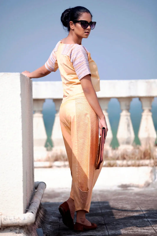 Immerse yourself in the world of Kshitij, where the dynamism of cityscapes and the charm of nature are interwoven together in hand-spun garments. This collection is inspired by the ever-advancing urban skyline against the milieu of serene landscapes. Kshitij showcases a commitment to treasuring a more eco-conscious planet and rural craftsmanship. Every piece of clothing is meticulously crafted by skilled weavers using natural processes & techniques to provide sustainable livelihoods in rural communities. The unique color palette of Kshitij is created from the dark blues of midnight skies to the warm earthy browns of fertile soil. It is also complimented by positive accents of sunlit yellows, vibrant greens, and bright oranges. With minimalist quilting and applique detailing inspired by geometric cityscapes, the Kshitij garments feature easy relaxed fits and layered asymmetrical jackets, featuring timeless elegance that resonates with those who appreciate fashion with a conscience. Embracing a style that harmoniously blends urban vibrancy with the serenity of nature's palette.