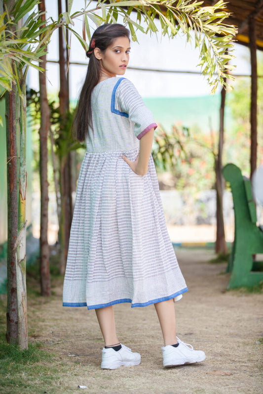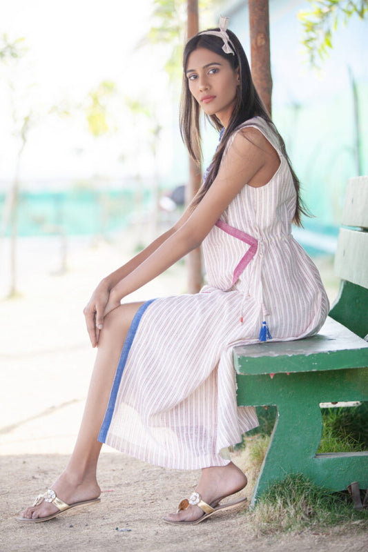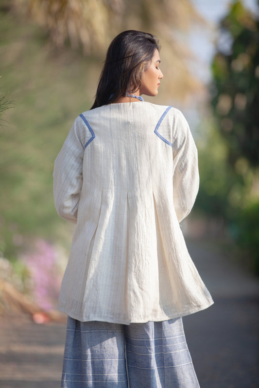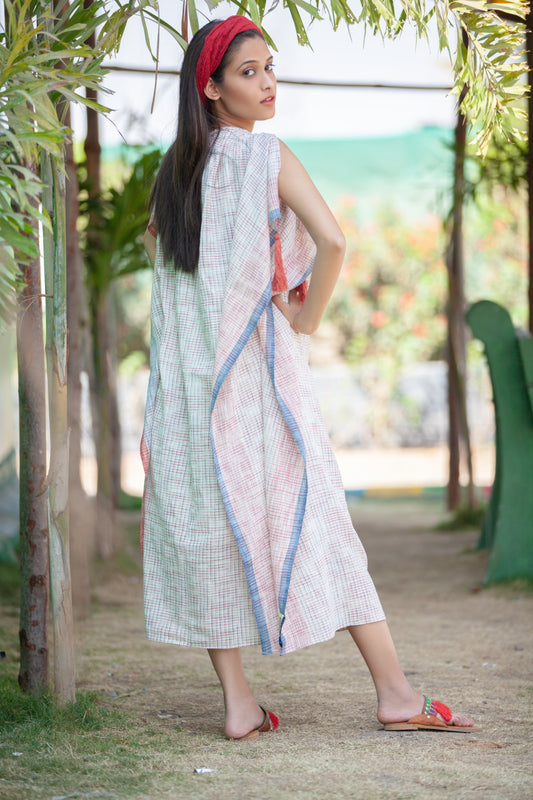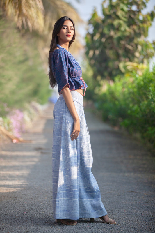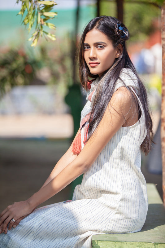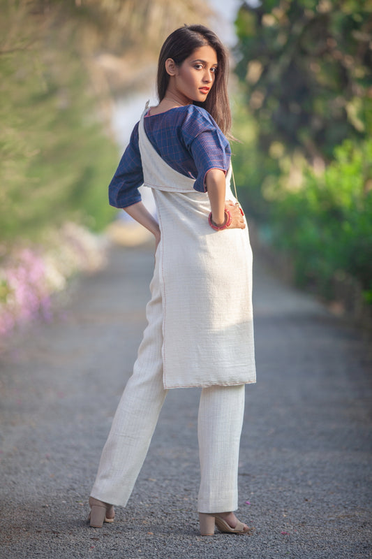 Welcome to our TRAVERSEE collection, where every stitch conveys an extraordinary expression! Our journey began with handwoven organic cotton, supporting the livelihoods of cotton farmers and gifted female weavers. This luxurious, trans-seasonal collection is here to tell you a touching story of mindful fashion and sophistication. Inspired by traditional communication tools, our collection features unbleached, undyed kora cotton, embodying a touch of simplicity & elegance. The timeless beauty of organic cotton is yarn-dyed in skin-friendly natural hues of Madder and Indigo. Crafted with rich textures by the adept hands of skilled women at the Gudi Mudi Project of Women Weave in Maheshwar, India, each piece represents the ethics of slow fashion and zero waste. The contemporary designs of this curated collection come with a relaxed fit and celebrate the charm of intricate weaving techniques and hand-spun fabrics. The collection embraces state-of-the-art features such as drawstring fasteners and paper fold envelopes, allowing for size transitions and easy silhouettes. Vaibbhavi P’s TRAVERSEE collection is designed for the mindful women who value mindful choices and desire to establish a fashion statement that stands out. Embrace the elegance of conscious luxury that gives a voice to your inner essence & persona.