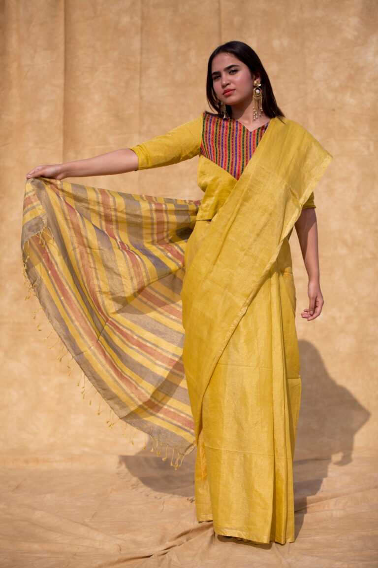 The glow of Swarn-Molten gold and zari tar cotton tissue handwoven in Maheshwar.  This sari has beautiful striped pallu inspired by the Mashru stripes in Neelam, Panna, Swarn and Zari.